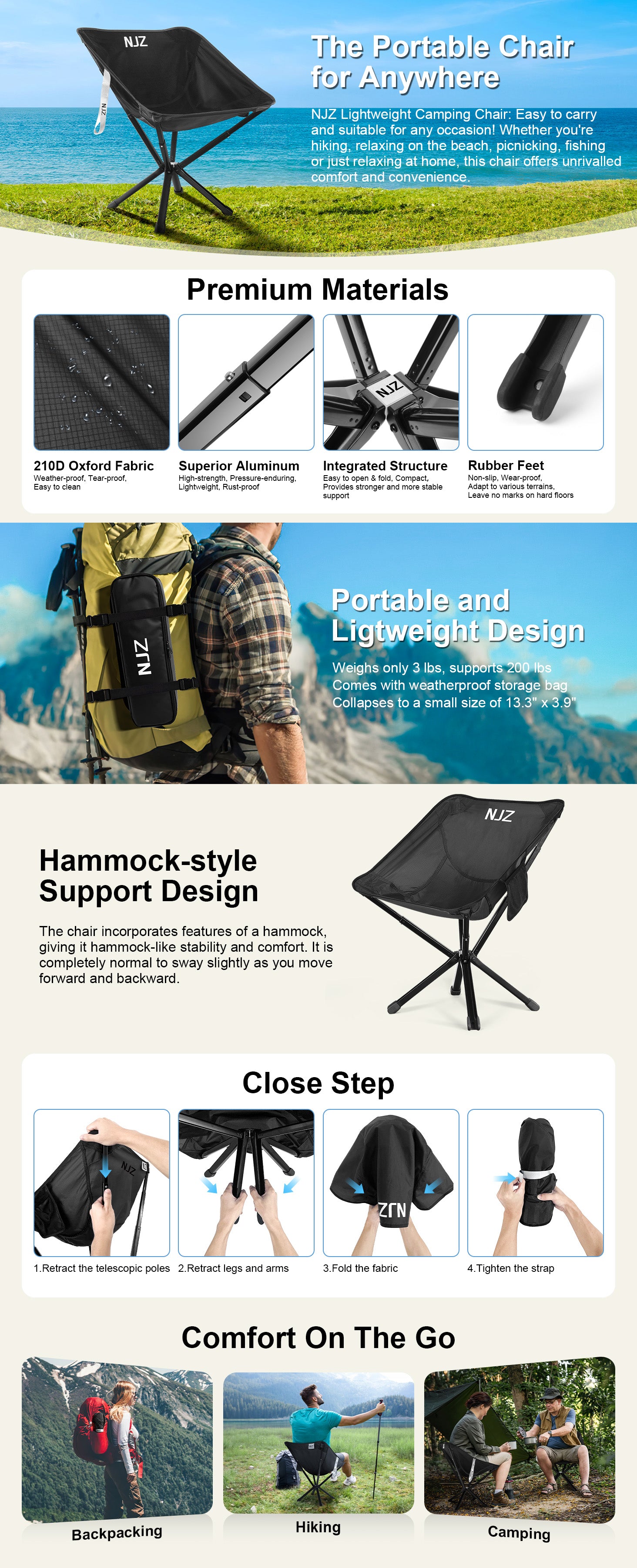 - Ultra Portable & Compact: Weighing just 3 lbs, the NJZ compact camping chair collapses to a small size of 13.3 x 3.9 inches, resembling a water bottle. The folding camping chair comes with a weatherproof bag with included cotton pad, is great for hiking
