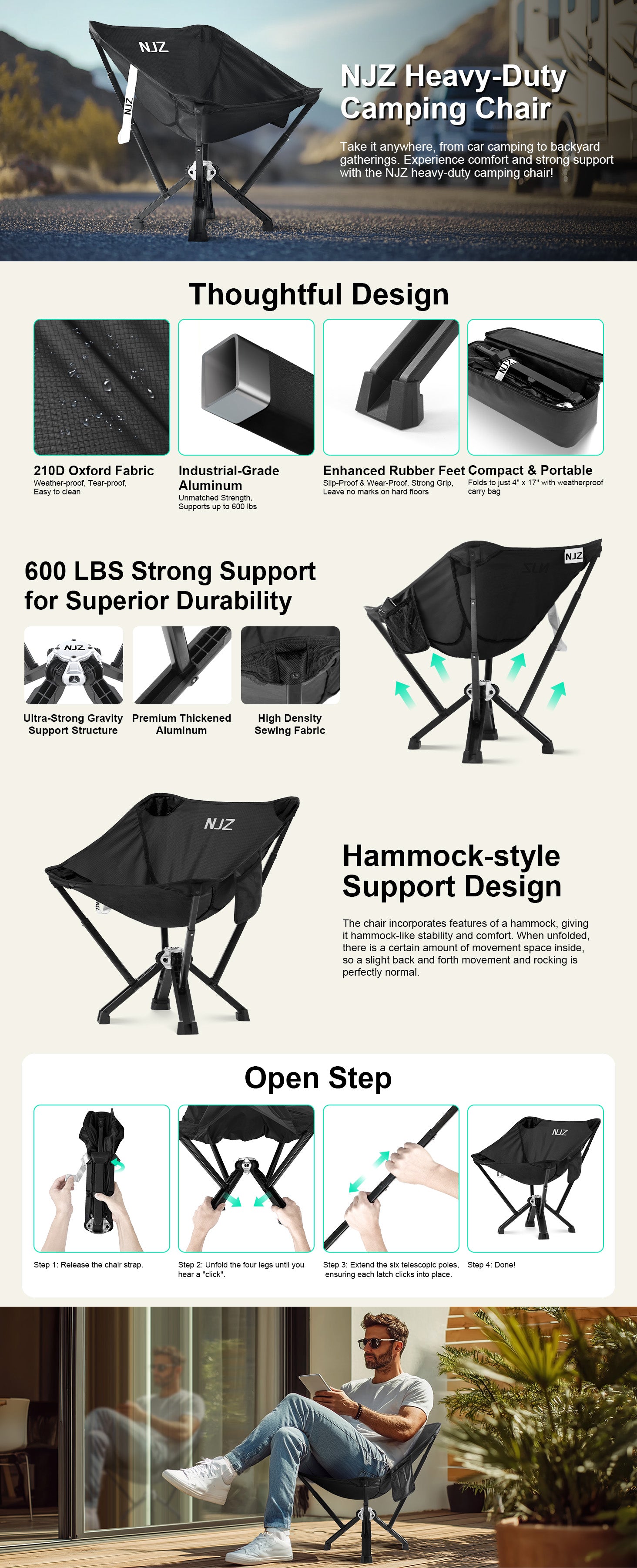 The NJZ Camping Chair offers solid support with its 600 lbs weight capacity. Itâs comfortable for long periods and folds easily into a compact size, making it perfect for outdoor adventures. The included carry bag adds to its convenience.