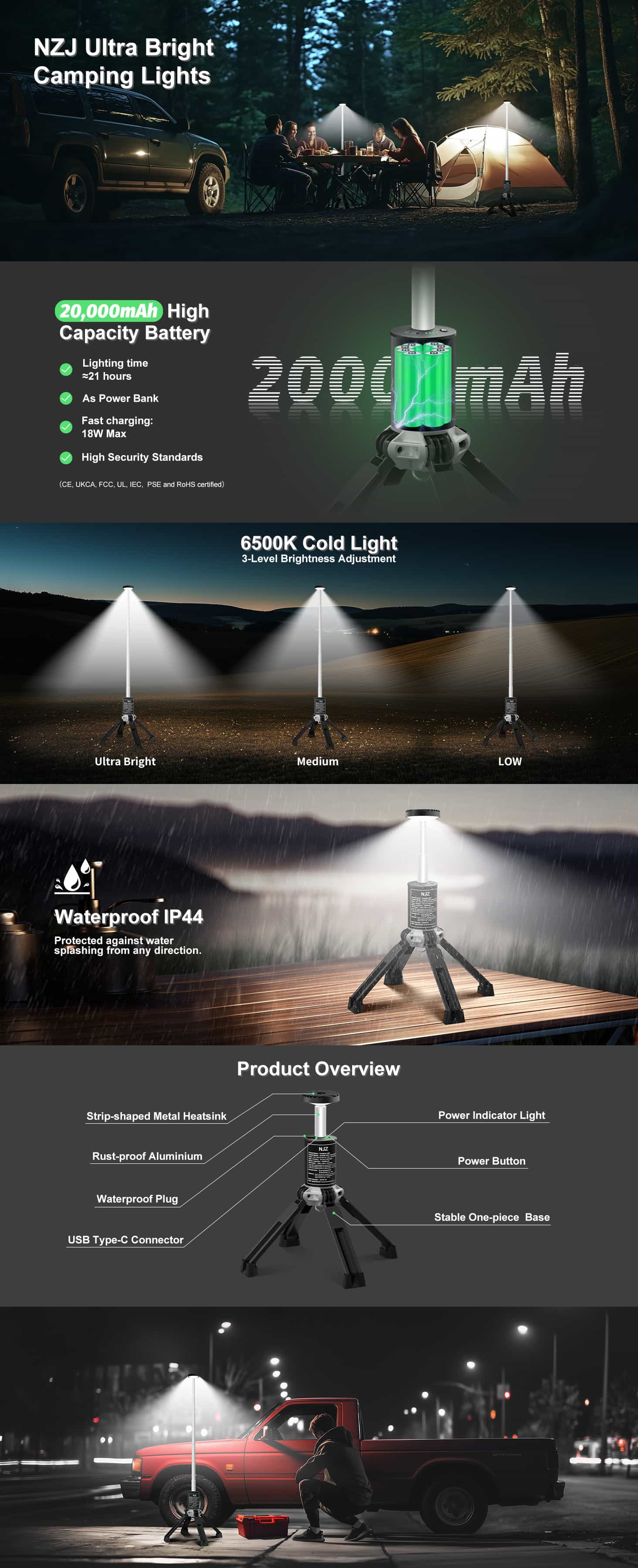 • 20,000mAh High-Capacity Battery: NJZ camping lamp provides up to 21 hours of illumination and doubles as a portable power bank for quick charging of your phone and devices, eliminating your worries about outdoor lighting and power supply