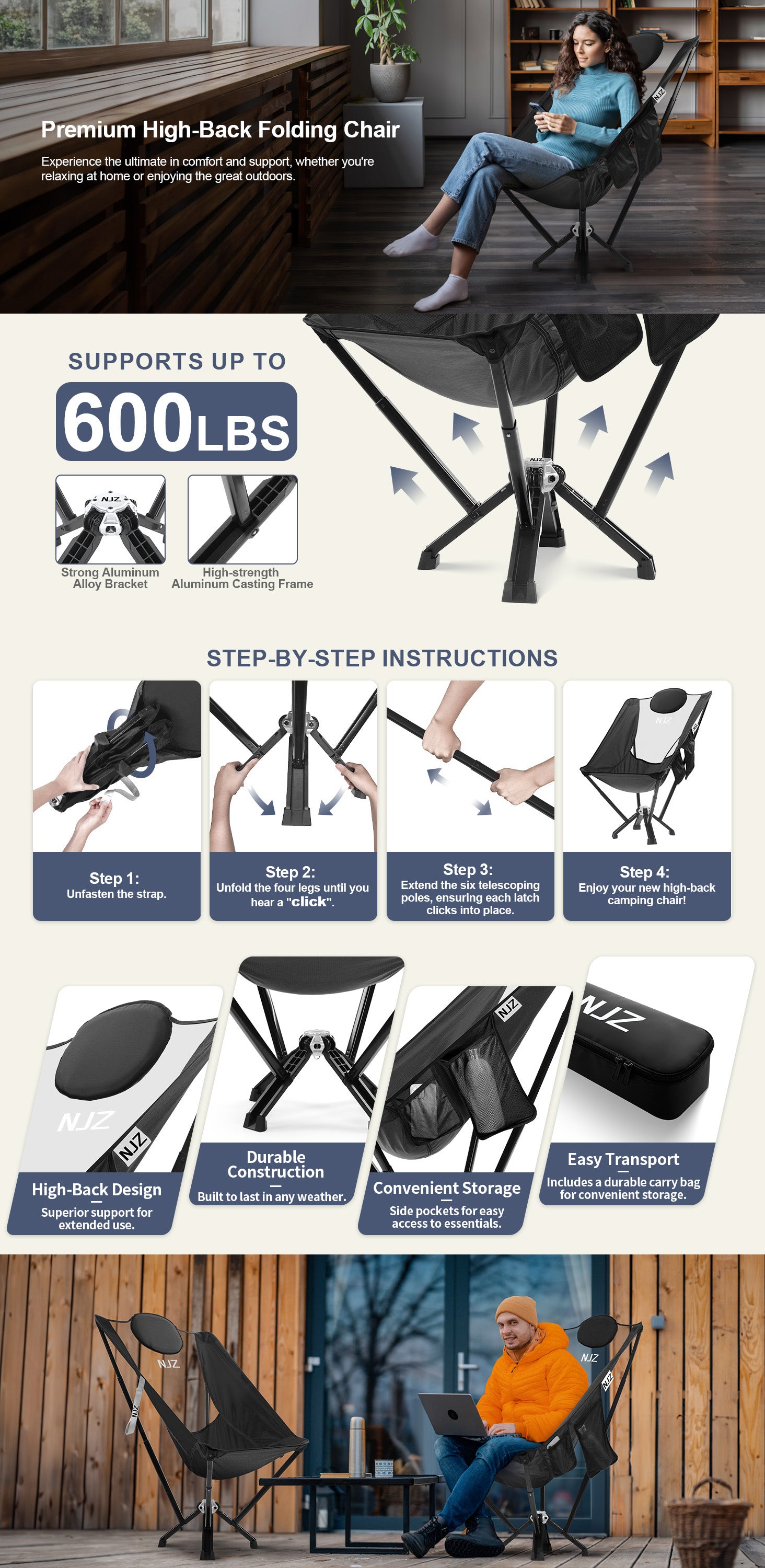 - Oversized Comfort: The NJZ high back camping chair supports up to 600 lbs, great for big and tall individuals. Measuring 30" D x 35.5" W x 43" H, this oversized camping chair features a headrest for added neck support, ensuring the ultimate in relaxation